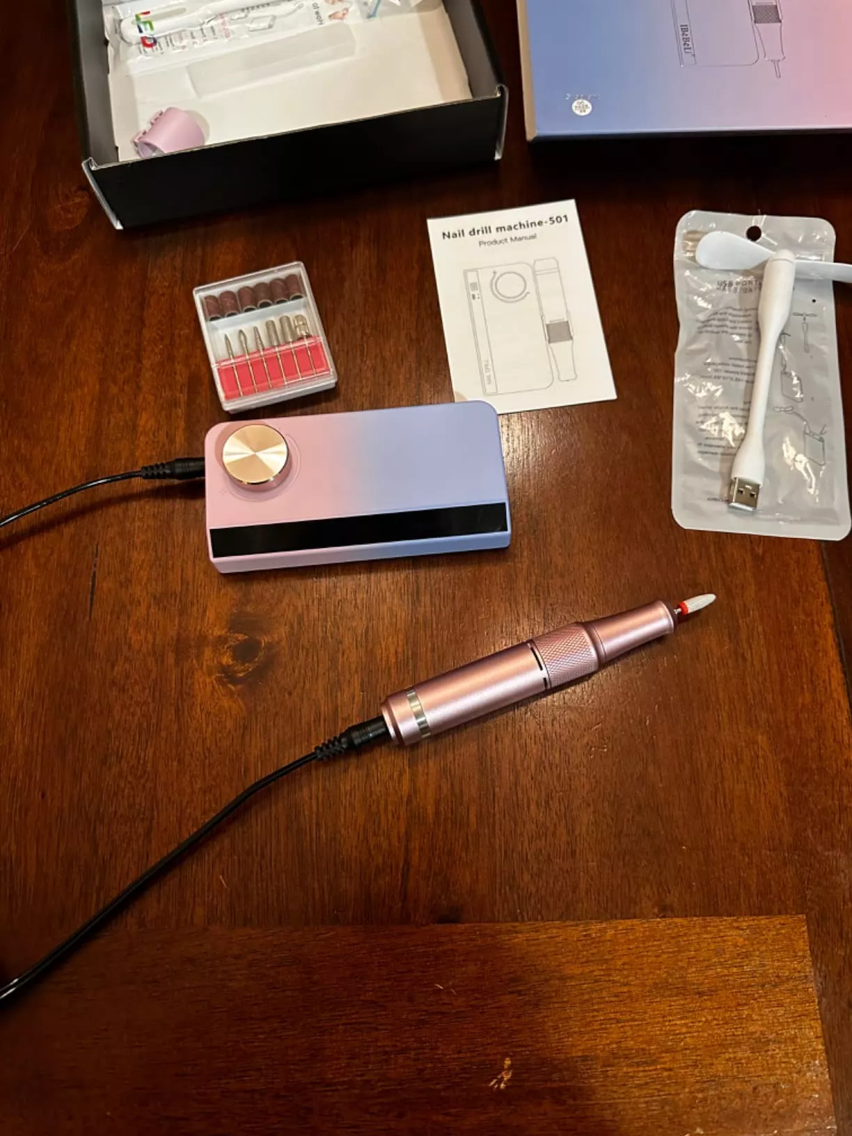 My wife, an avid DIY dip powder manicure enthusiast for nearly two years, has experimented with various drills but finds this one exceptional, especially adoring its unicorn/mermaid color gradient. The package is comprehensive, including a wide range of accessories and the convenience of a rechargeable design. The digital display and memory feature for speed settings enhance its user-friendliness. The included USB fan and flashlight, with their adjustable positions, add to its appeal, making manicure sessions more enjoyable even during our TV time, thanks to the bright and useful flashlight. The fan’s strength is impressive for its size, and while the device has a single USB port, limiting simultaneous accessory use, it’s a unique feature not found in her other drills. She highly recommends this drill for its distinctive features and overall quality.