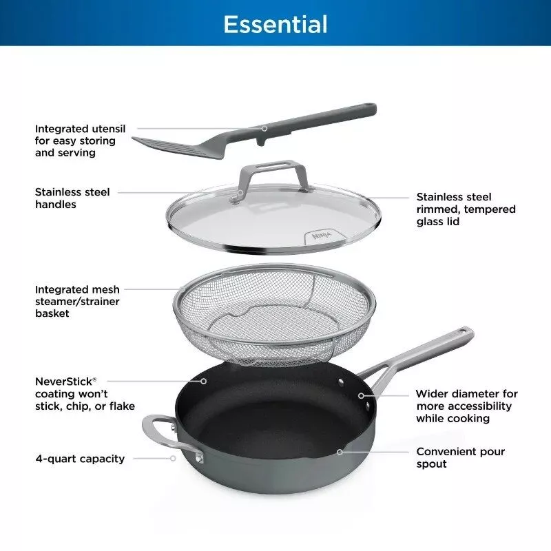 The NeverStick PossiblePan stands out with its innovative design and materials. Super-heated at 30,000°F, the pan boasts a plasma ceramic particle coating, ensuring a lasting non-stick surface. The integrated utensil and steamer/strainer basket add to its uniqueness, offering functionality that goes beyond traditional cookware.