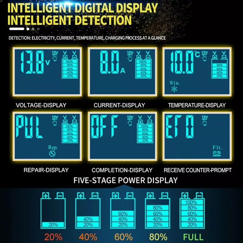 What sets this charger apart is its blend of advanced technology with user-friendly design. The Smart LCD Display provides clear, easy-to-read information, making it accessible for all users. Its automatic adjustment to environmental temperature and multi-stage charging process not only protects your battery but also enhances its overall performance and longevity.