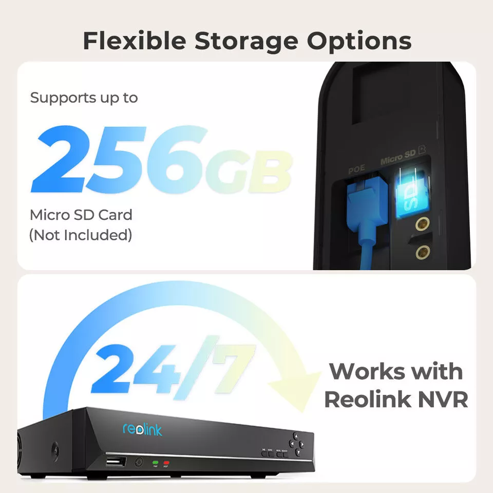 - Flexible Storage Options: Choose between local Micro SD card storage or Reolink NVR integration.
