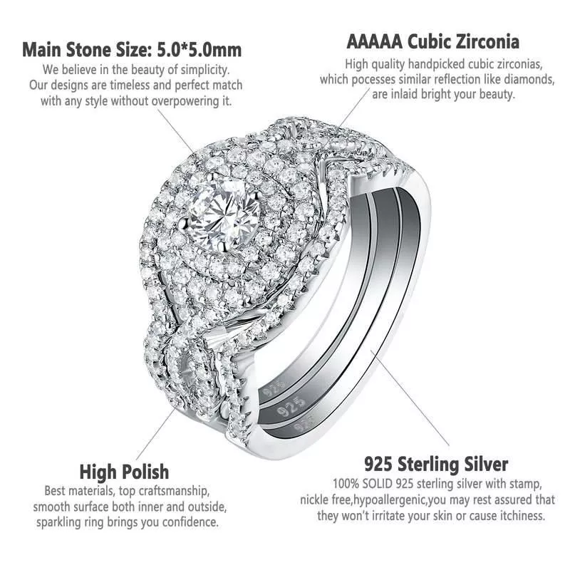 Discover the perfect symbol of your love and commitment with our Sterling Silver 3Pcs Wedding Ring Set. Exquisitely crafted with fine details and a brilliant shine, these rings are designed to celebrate your union with timeless elegance. The round-cut cubic zirconia centerpiece dazzles with a clarity and brilliance that mirrors the depth of your affection, making every moment together sparkle.