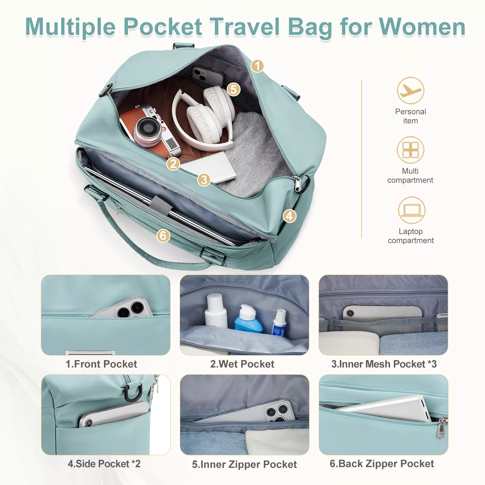 This travel tote is not just about looks; it’s packed with features that make it the ideal companion for any trip. The spacious main compartment offers ample room for your clothes, shoes, and other essentials. Plus, the dedicated laptop compartment ensures your tech is protected and easily accessible. Here’s what makes our bag stand out: