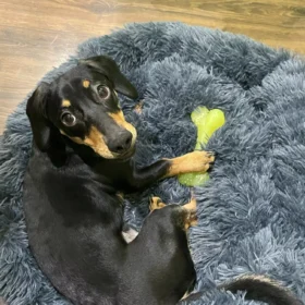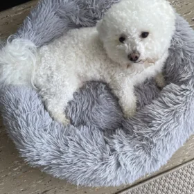 It’s a soft and cushy bed for your furry friends. My 12-pound Cotton Dr Tulear dog fits comfortably in it, and my 9 lb cat has also taken a liking to it. It even fits inside a 48-inch dog crate. While my dog isn’t destructive, if you have a chewer, you may want to consider a bed they can’t tear apart, as this one has shag fur. Nevertheless, my pets adore this bed.