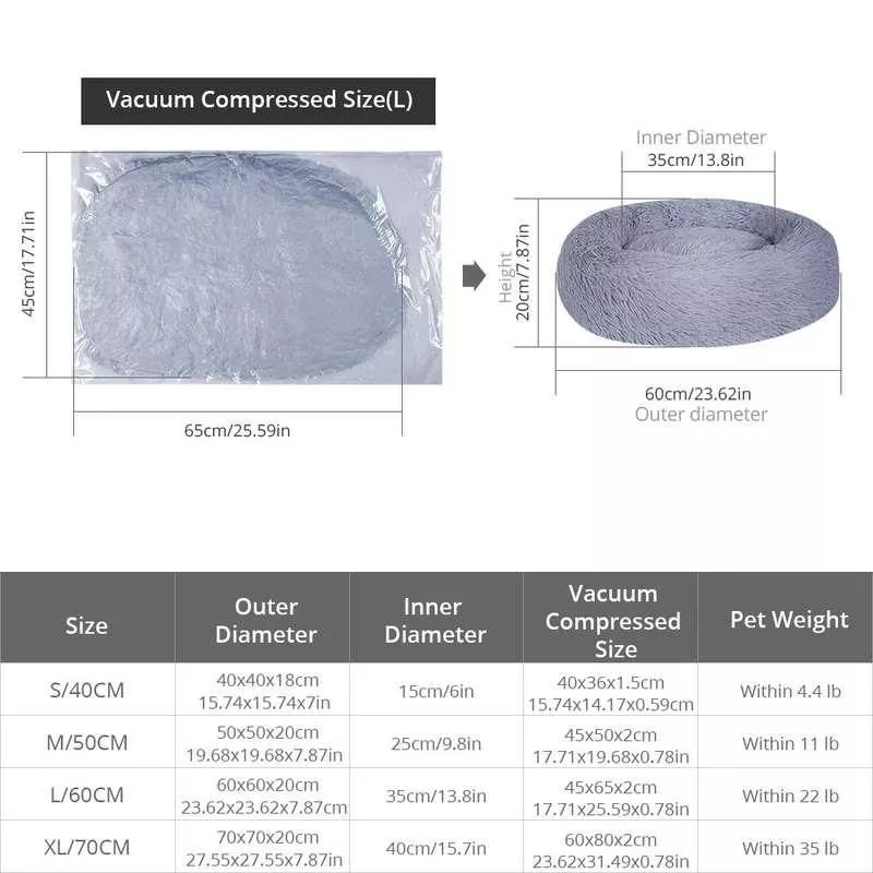Cute and fluffy pet bed. My two 3kg yorkies fit both in there, and are totaly loving it! I was so surprised when the package came cause it was so small thanks to the vacuumed and folded bag. But it fluffed up immadiately when I opened it. Thanks seller
