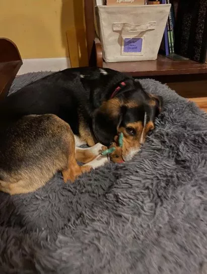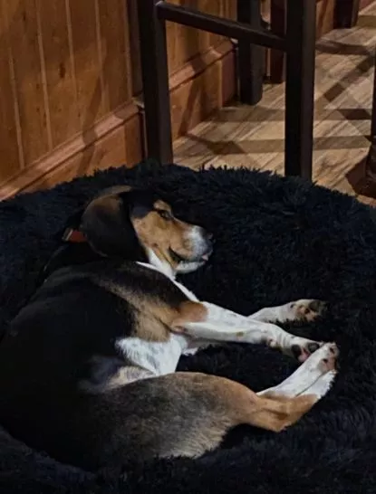 This picture was taken on New Year’s Eve while fireworks were going off like crazy. Normally, during a storm or fireworks, she paces the floor. This year she slept right through it. She absolutely loves it.