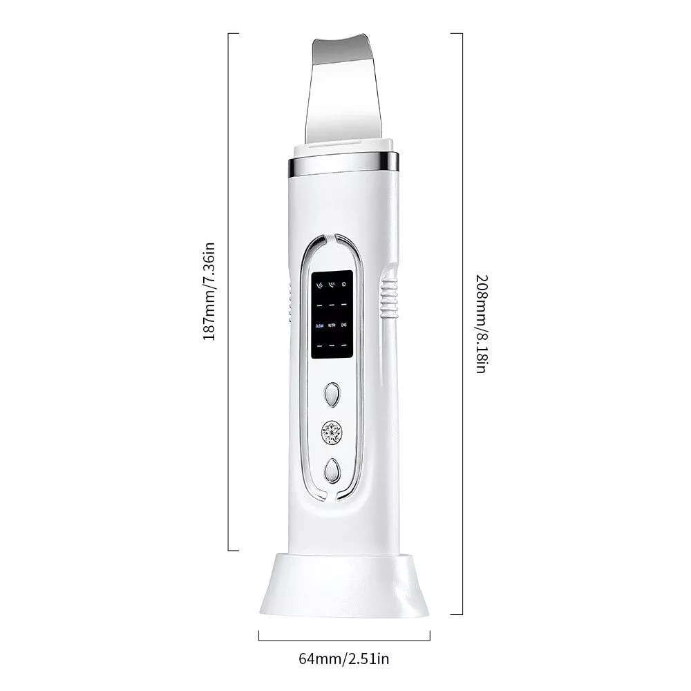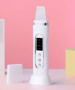 Our Ultrasonic Skin Scrubber is not just effective but also user-friendly and safe. It’s CE certified, ensuring high-quality standards. The device is powered by a USB charger, making it convenient for both home and travel use. Made from durable plastic, it’s designed for longevity. Its compact size (18.7 x 4.3 x 1.5 cm) and light weight (340g) make it easy to handle and store. The pack includes the scrubber, USB data cable, host, manual, and base.