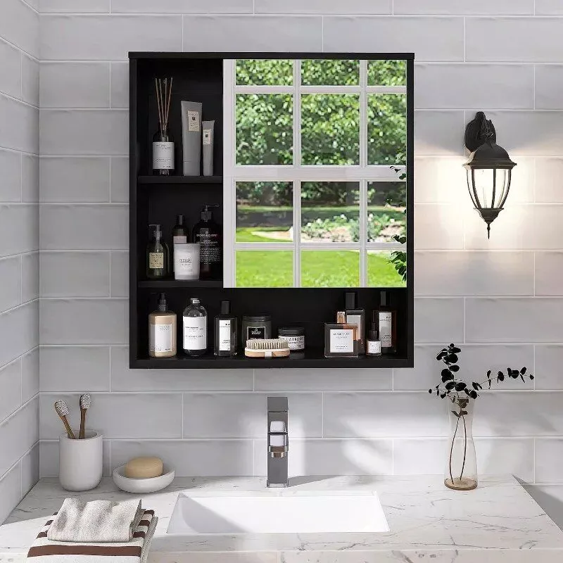 - Spacious Storage: Includes a fixed top shelf, two interior shelves behind the mirror with adjustable heights, and three open shelves for easy access.