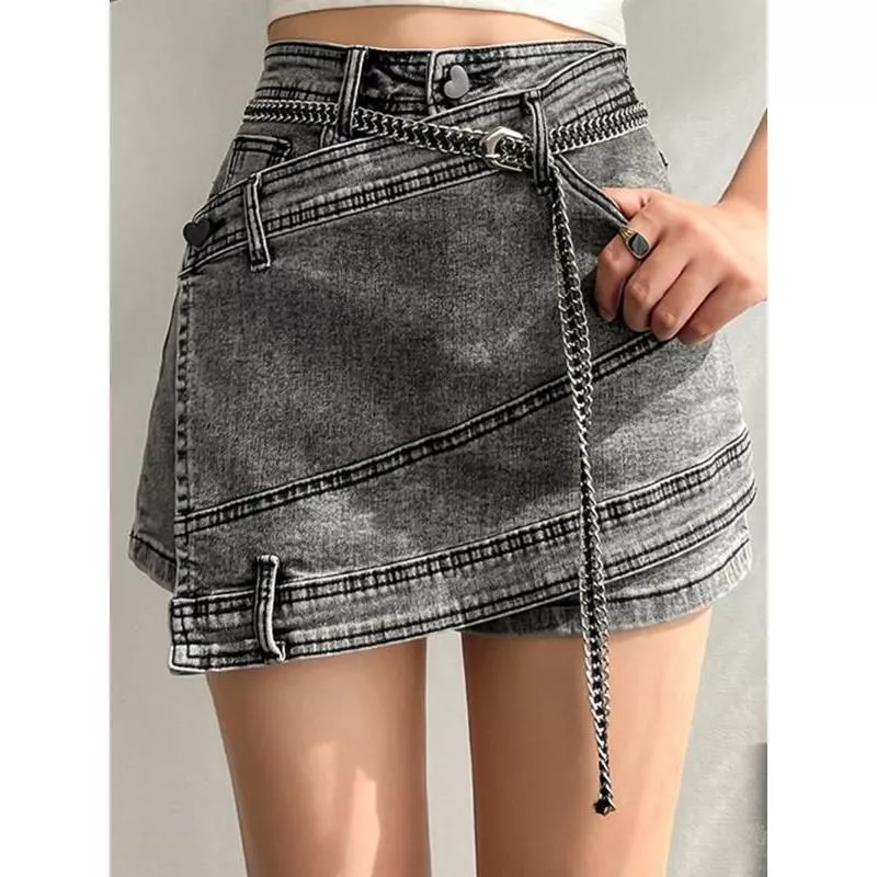 Elevate your summer wardrobe with our Fashion Women’s Denim Skirt. This high-waisted masterpiece in a trendy gray shade with irregular chain splicing brings a touch of edgy sophistication to your look. Designed to flatter and turn heads, this skirt is a must-have for the fashion-forward woman.